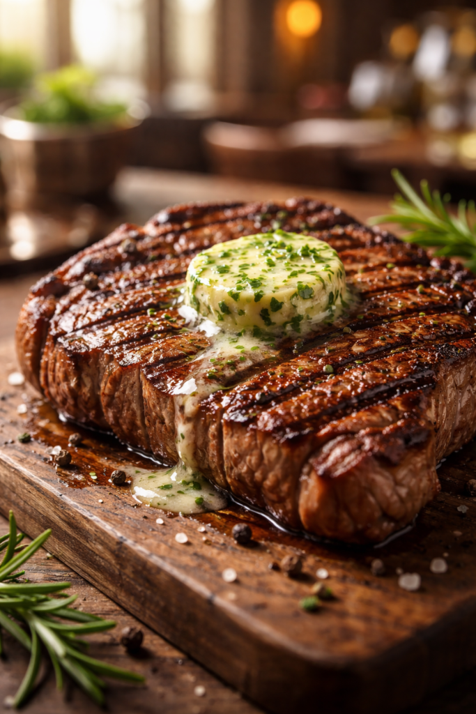 Immaginate di gustare una bistecca alla griglia con segni di cottura perfetti, irresistibile non solo al palato ma anche alla vista. La carne, cotta alla perfezione, svela un succulento gioco di colori e texture, mentre il burro alle erbe che si scioglie in superficie aggiunge quel tocco gourmet che ogni amante della cucina cerca.