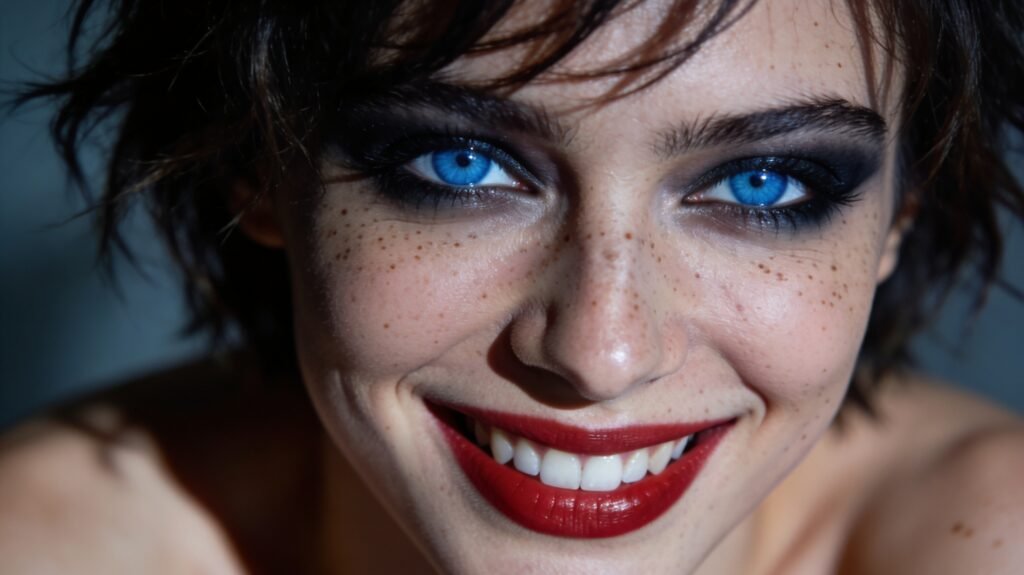 La fotografia è iperdettagliata e cattura la luce soffusa in modo da rendere ogni dettaglio straordinario. Il trucco scuro accentua la bellezza del soggetto, offrendo un contrasto affascinante che attira l’attenzione dell’osservatore. Il portrait è realizzato in formato testa e spalle, permettendo di focalizzarsi sul viso e sull’espressione vivace del soggetto.