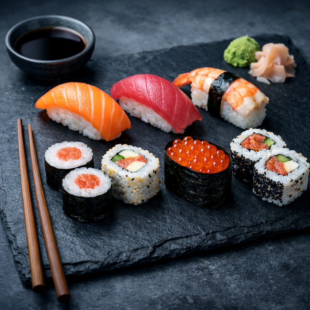 Il sushi misto è molto più di un semplice piatto giapponese; è un’esperienza sensoriale che unisce sapori, colori e presentazione. Quando si tratta di un’immagine generata dall’intelligenza artificiale, un’immagine di sushi misto disposto in una composizione minimal su ardesia nera è particolarmente affascinante.